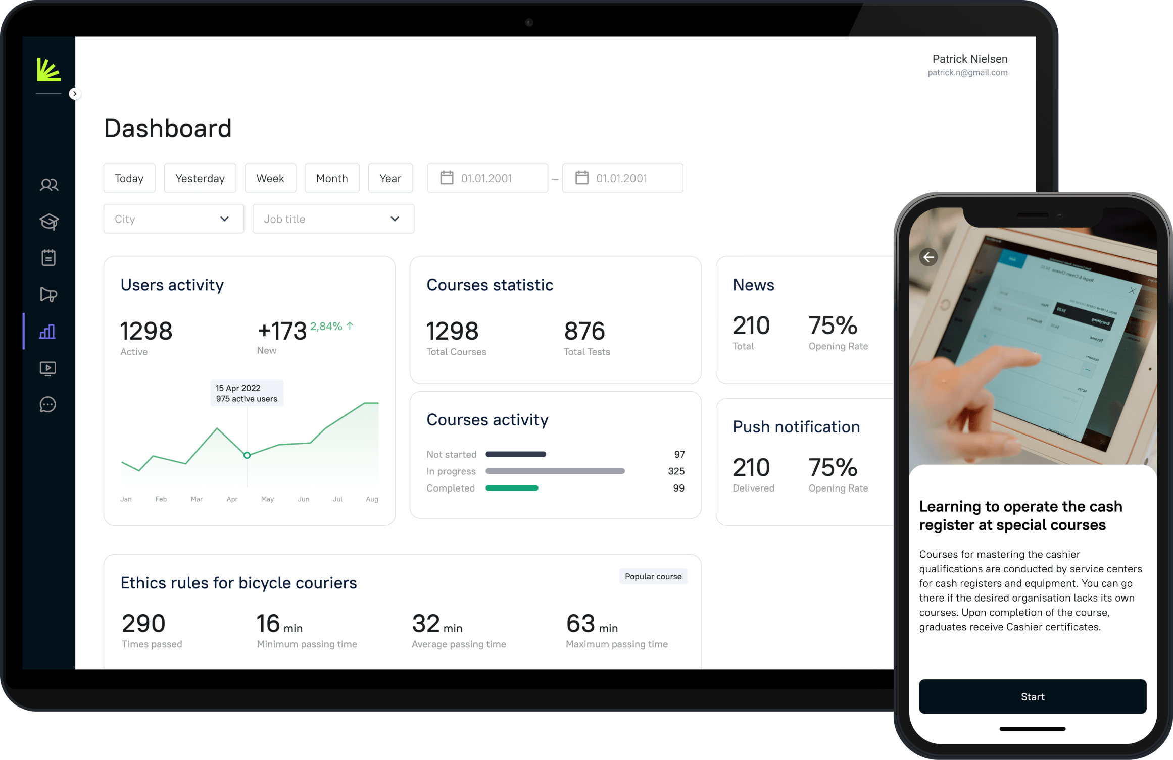 Analytics and course results can be found in your personal account. If needed we can help you to set up the necessary data collection for your task.